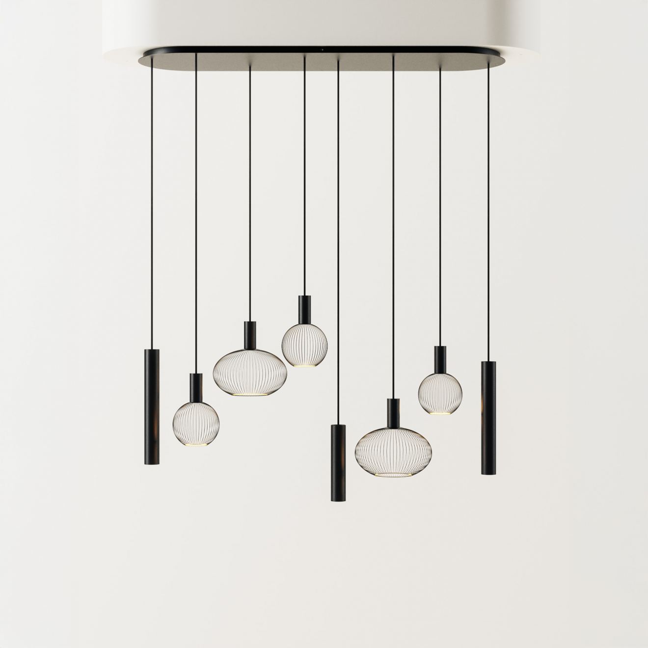 Wat Como onderscheidt, is de eenheid in kleur. Het volledige armatuur, van plafondplaat tot snoeren en lichtbronnen, wordt uitgevoerd in één kleur. Dat geeft het ontwerp een rustig en samenhangend karakter.