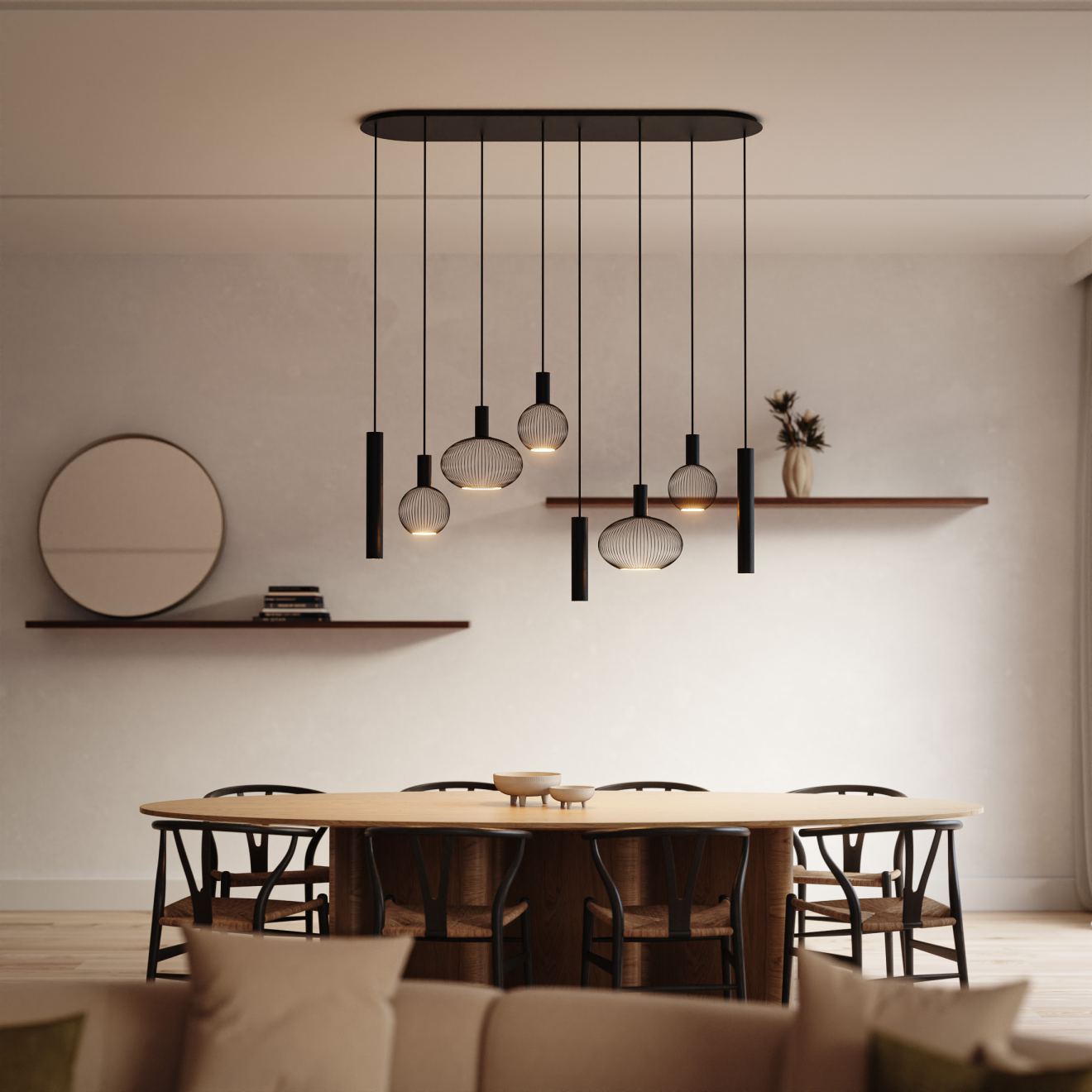 De acht lichtpunten combineren direct en diffuus licht. Zo ontstaat een gebalanceerd lichtbeeld: helder waar nodig, zacht in uitstraling. Schaduwen blijven subtiel en het licht voelt comfortabel aan. Prettig voor lange avonden aan tafel.