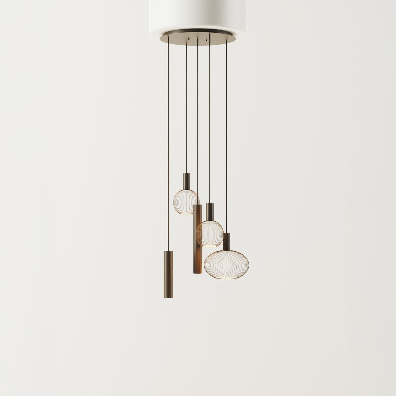 De vijf lichtpunten zijn verdeeld rondom de ronde plafondplaat. Deze opstelling creëert een gebalanceerd lichtbeeld met een natuurlijk spreiding. Het licht combineert direct en diffuus, waardoor het helder is waar nodig en zacht in uitstraling. Schaduwen blijven subtiel en het geheel voelt rustig aan.