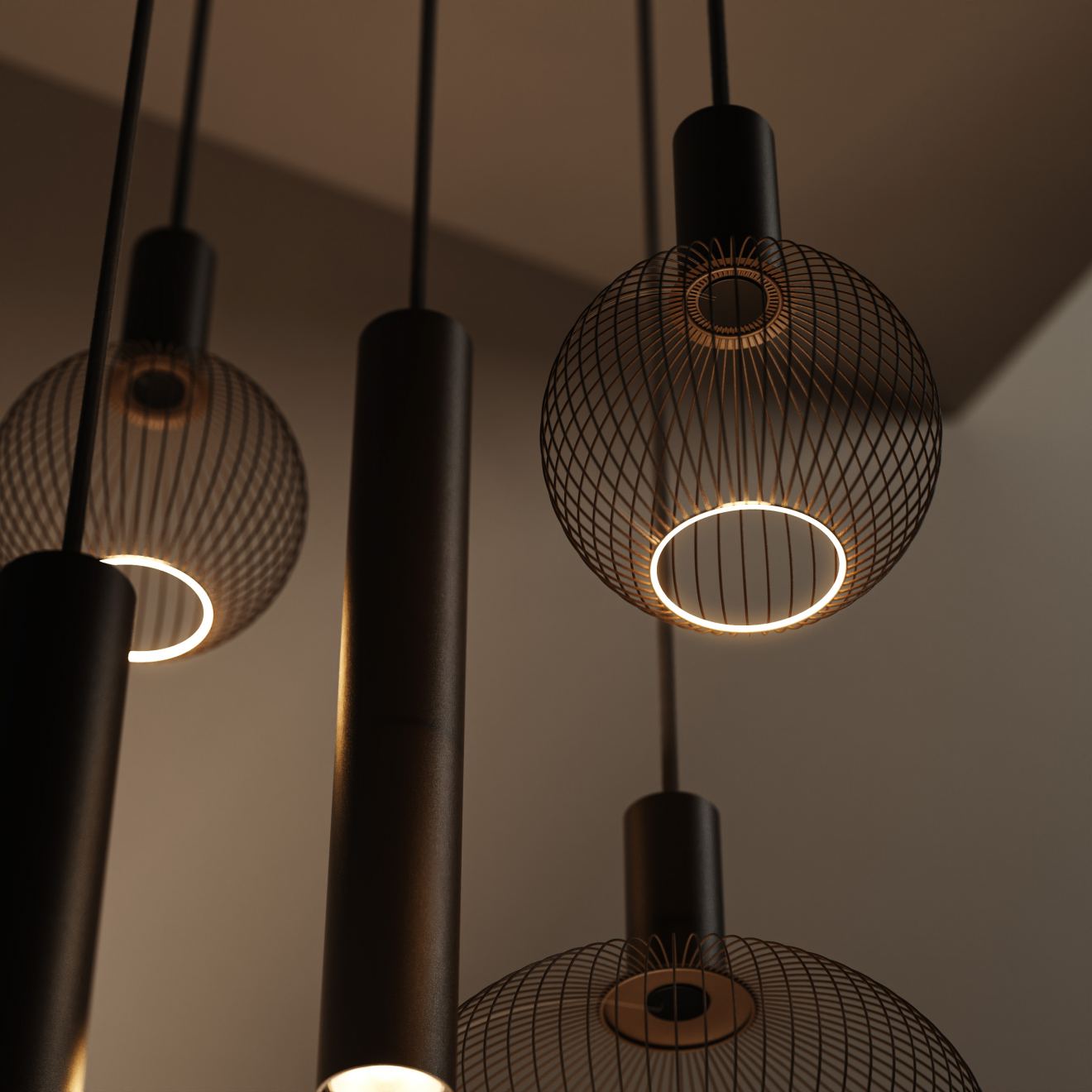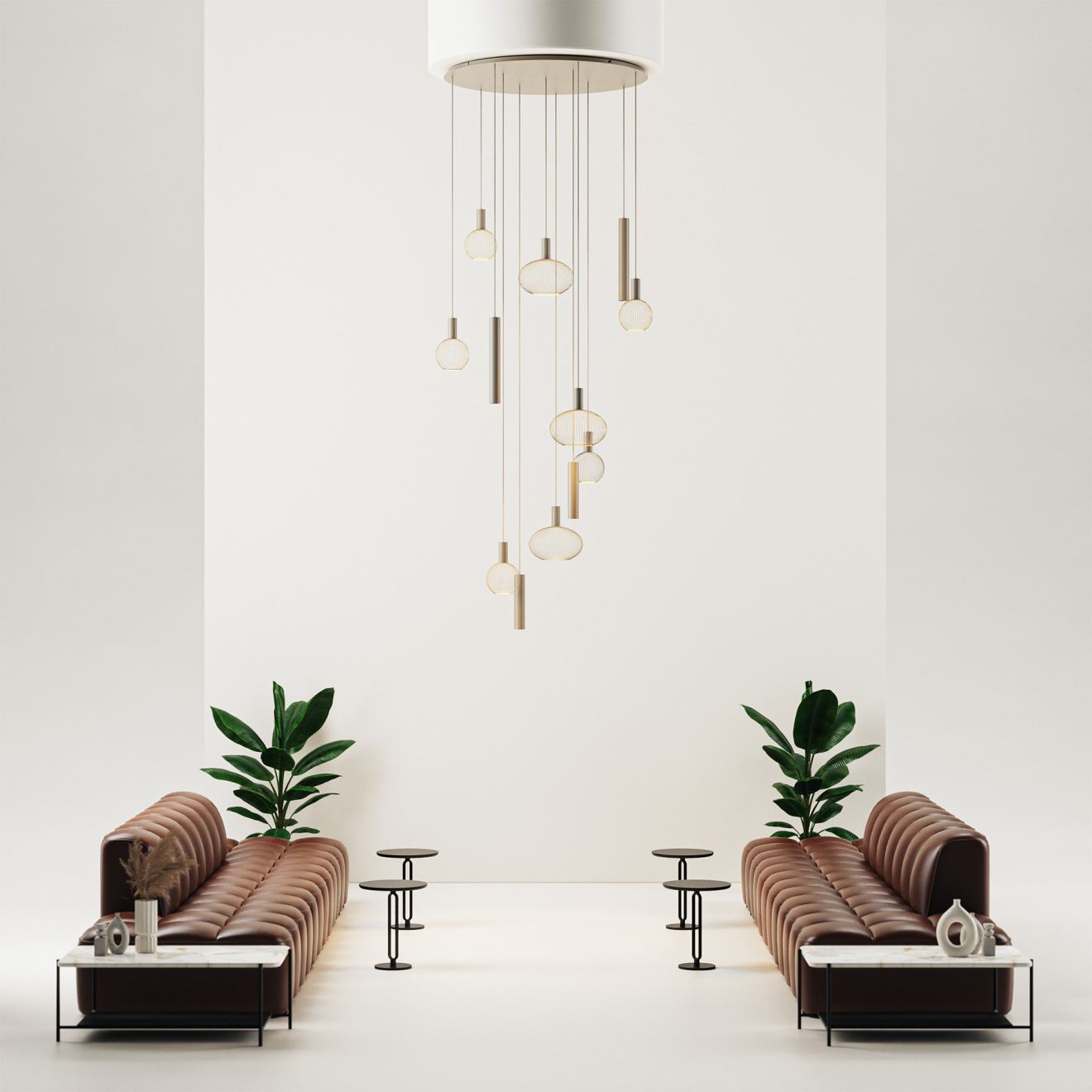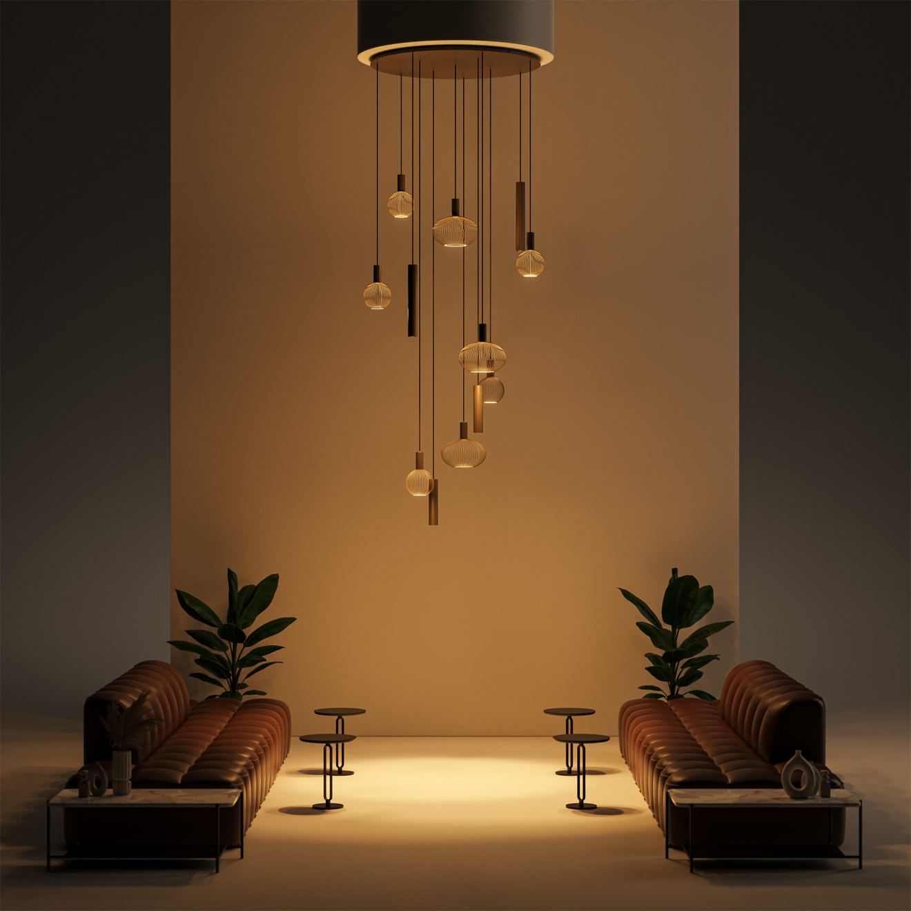 Como 9145 komt tot zijn recht in hoge woonruimtes of vide-opstellingen waar schaal en balans samenkomen. Overdag vormt het armatuur een architectonisch element in de ruimte, ’s avonds brengt het warmte en sfeer over meerdere niveaus.